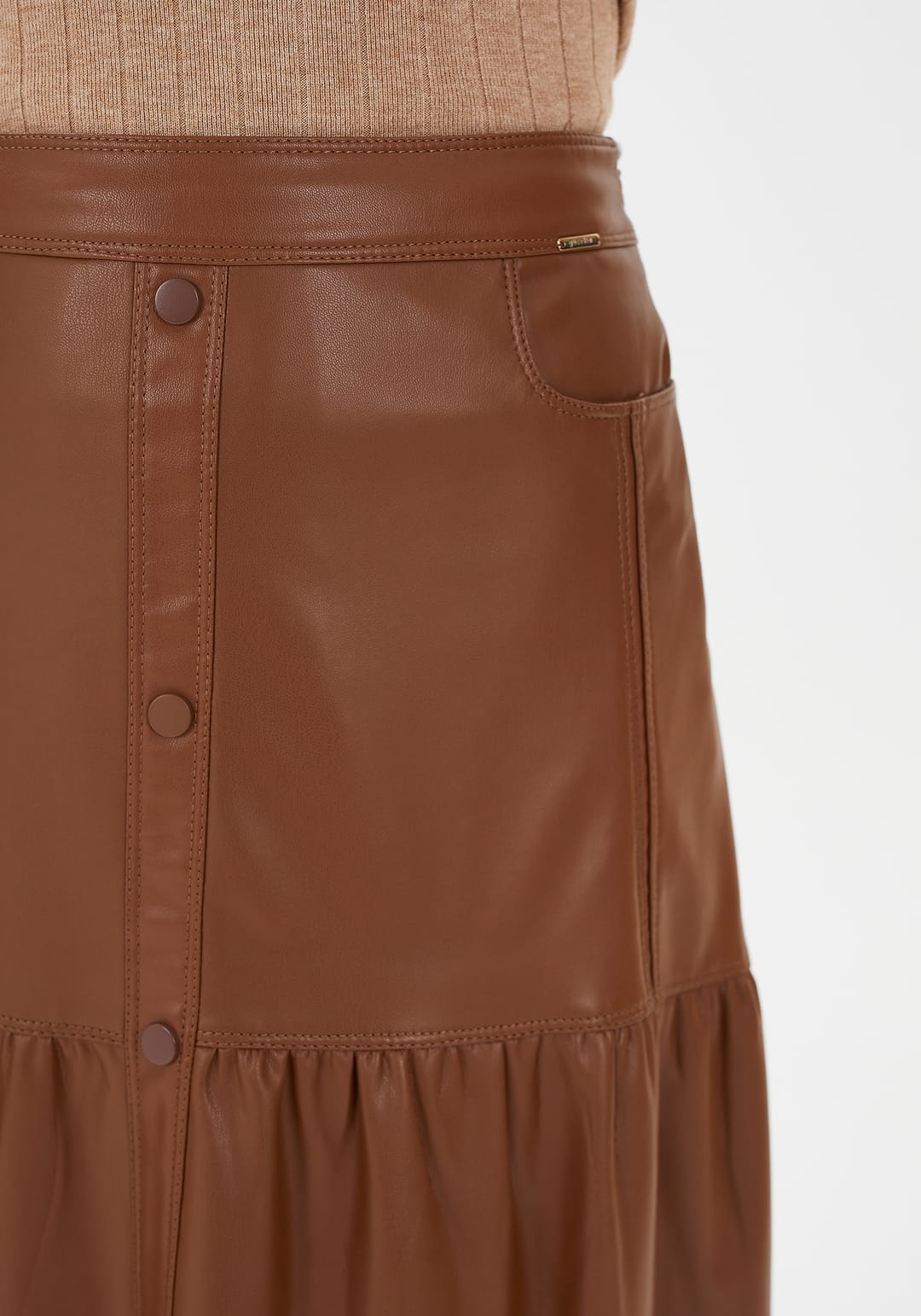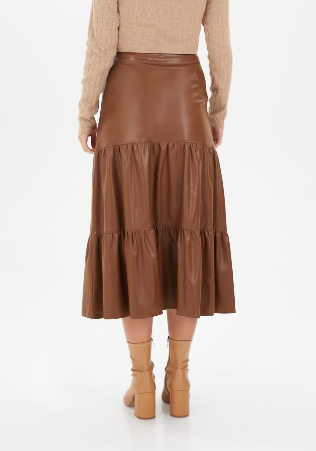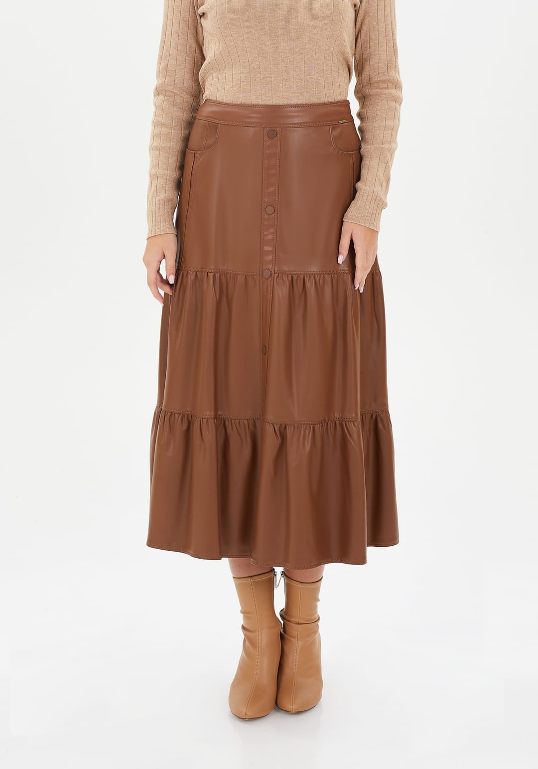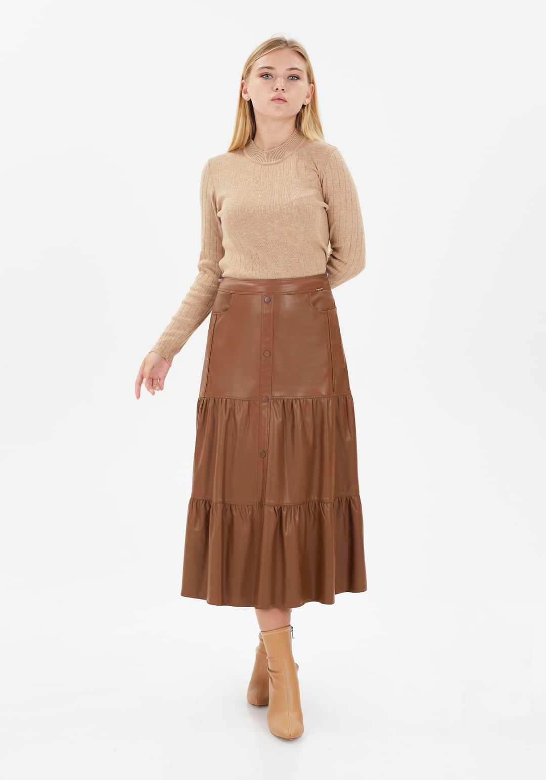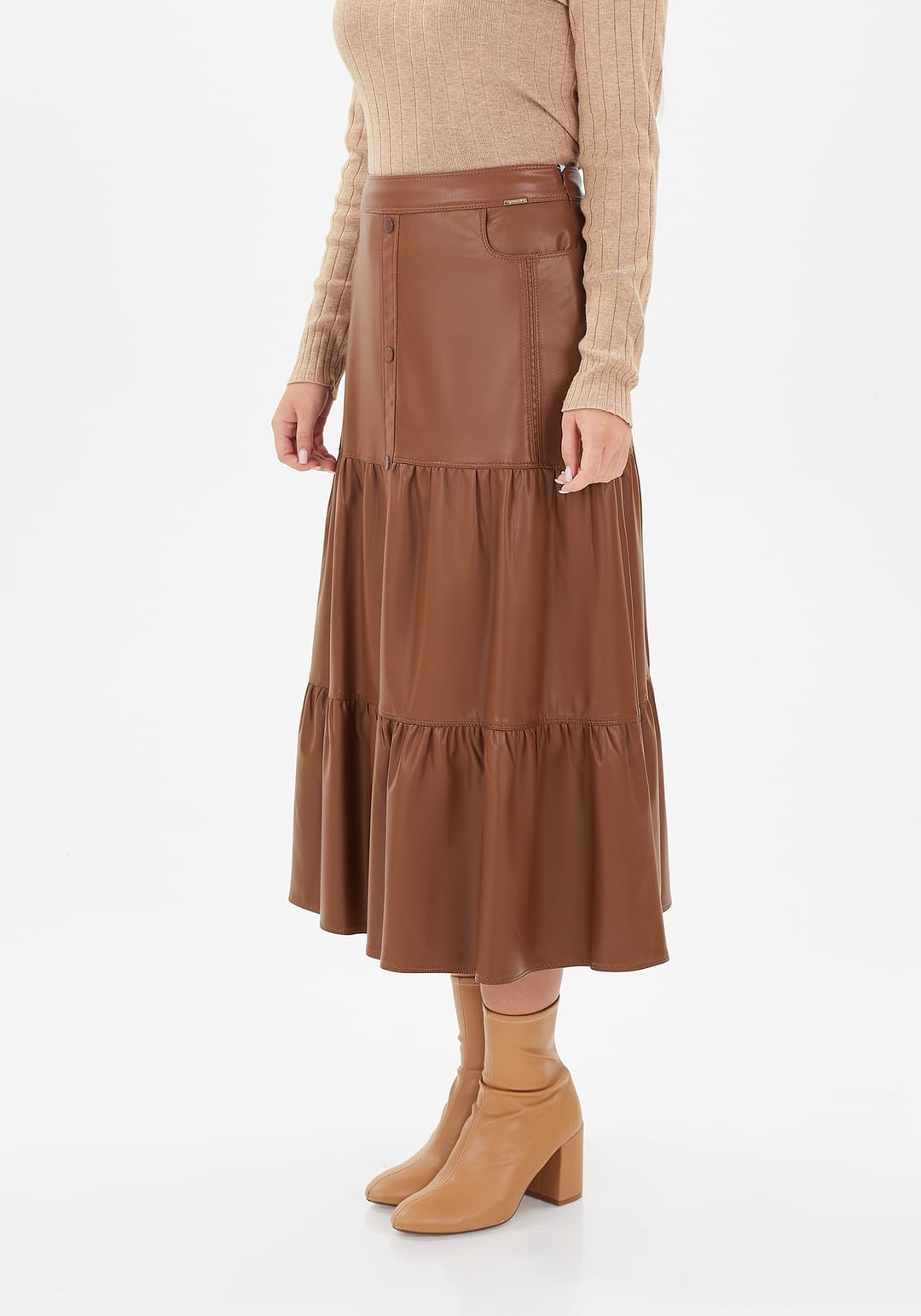 %100 suni deriden üretilen bu midi boy etek, 85 cm uzunluğuyla şıklığı ve zarafeti bir araya getirir. Manken bedeni 38 olan etek, mevsimlik olarak tasarlanmıştır ve düğme detayları ile modern bir stil sunar. Volanlı yapısı sayesinde dinamik ve hareketli bir görünüm elde edebilirsiniz. Dayanıklı suni deri malzemesi ile hem şık hem de uzun ömürlü bir kullanım sağlar. Gardırobunuzun dikkat çeken parçalarından biri olacak bu etek, her mevsim rahatça kullanabileceğiniz bir seçenek!